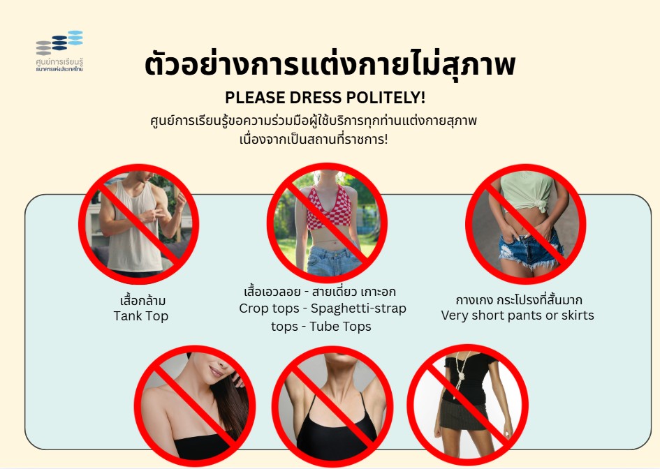 ศูนย์การเรียนรู้ฯ ขอความร่วมมือผู้ใช้บริการทุกท่าน แต่งกายสุภาพเรียบร้อย เนื่องจากเป็นสถานที่ราชการ ทั้งนี้ ขอความกรุณางดการแต่งกาย ดังต่อไปนี้