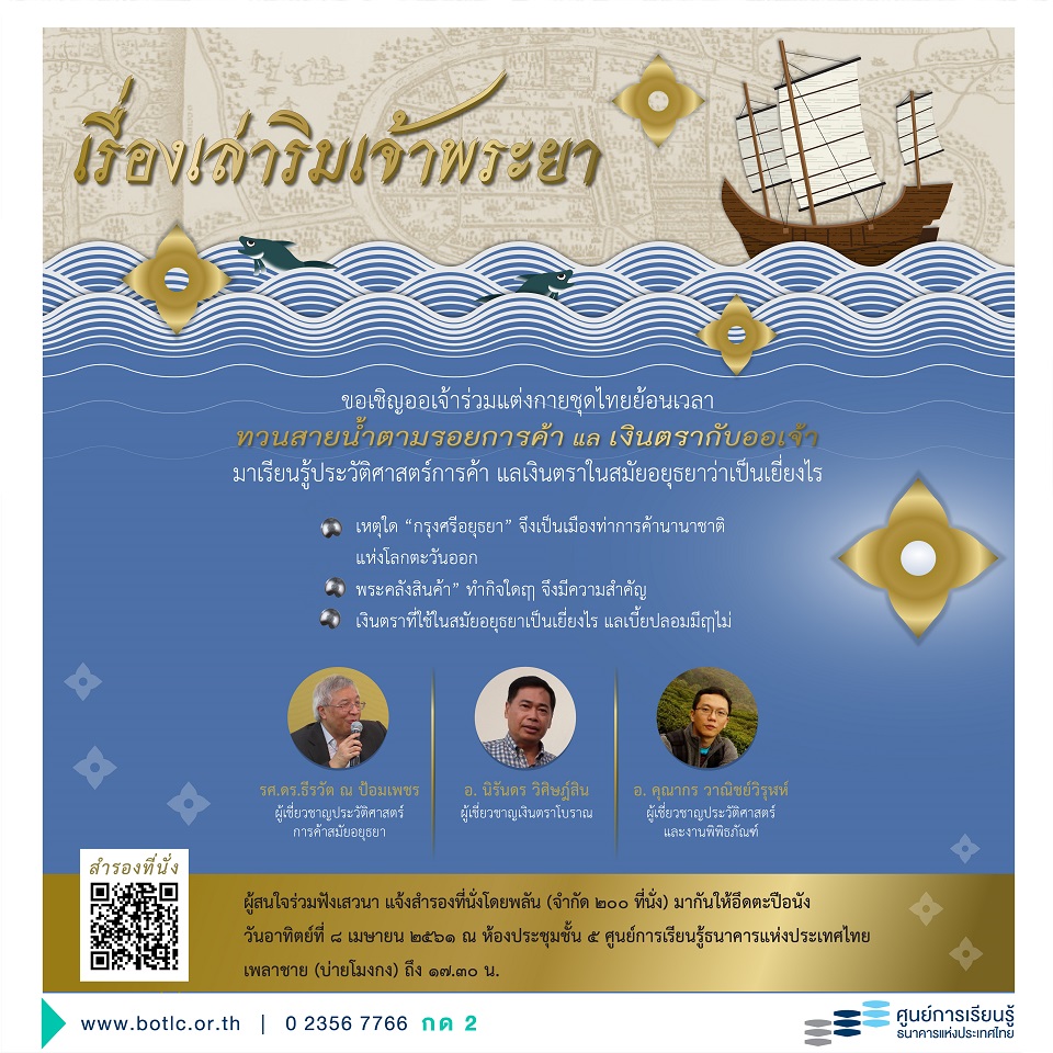 ศูนย์เรียนรู้ธนาคารแห่งประเทศไทย ขอเชิญคุณพี่แลแม่หญิงร่วมแต่งกายชุดไทยย้อนเวลามาเรียนรู้ประวัติศาสตร์การค้า แลเงินตราในสมัยอยุธยาว่าเป็นเยี่ยงไร ในงาน "เรื่องเล่าริมเจ้าพระยา ตอน ทวนสายน้ำตามรอยการค้า แล เงินตรากับออเจ้า"