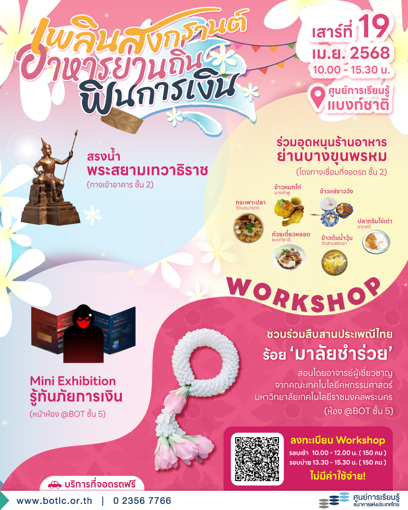 ชวนร่วมกิจกรรม "เพลินสงกรานต์ อาหารย่านถิ่น ฟินการเงิน" เสาร์ที่ 19 เม.ย. 2568 ที่ศูนย์การเรียนรู้แบงก์ชาติ