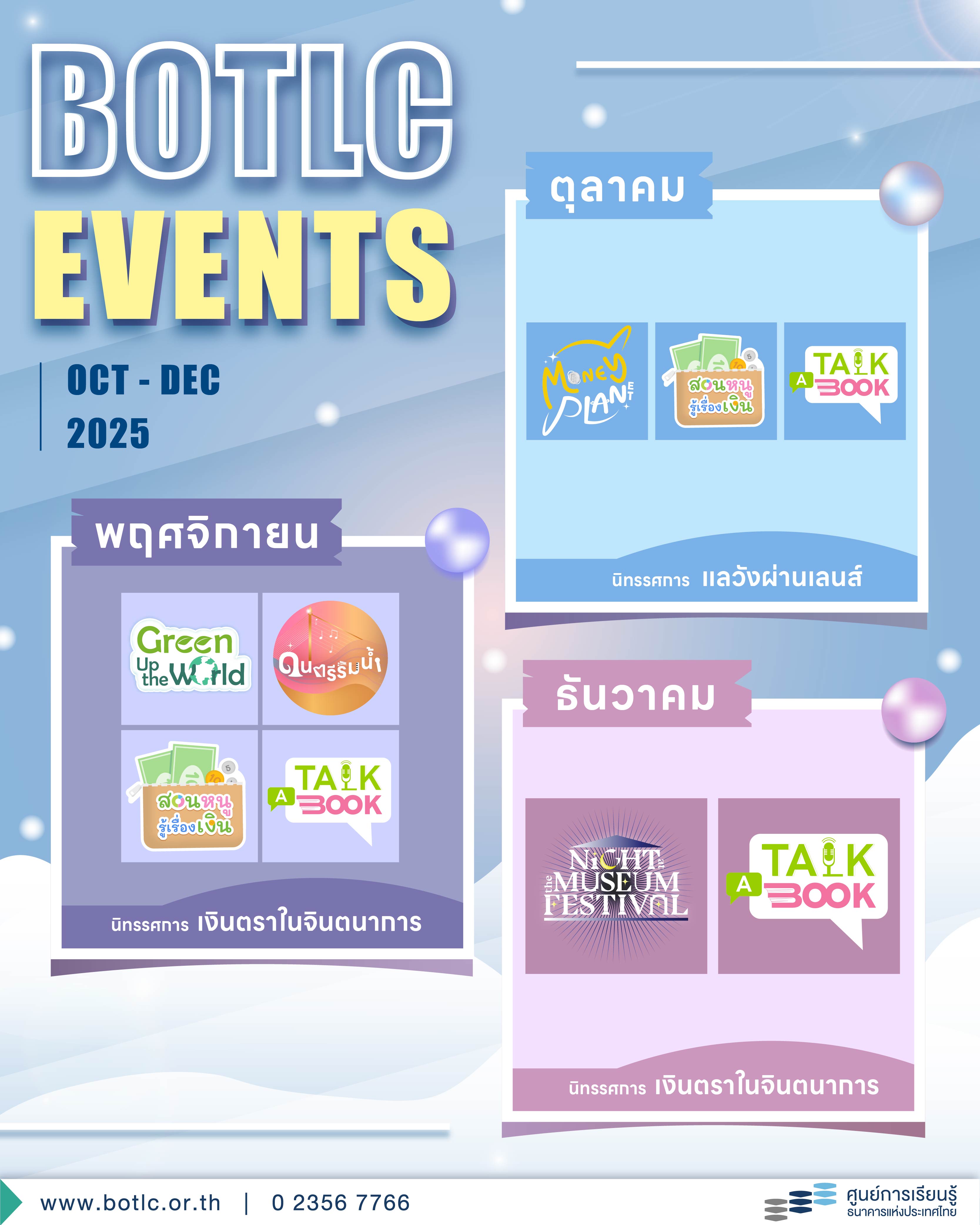 ติดตามรายละเอียดของแต่ละกิจกรรมได้ทางหน้าเพจของศูนย์การเรียนรู้แบงก์ชาติ - BOTLC นะคะ