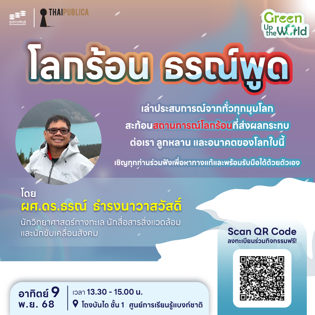 วันอาทิตย์ที่ 9 พ.ย. 68 ศูนย์การเรียนรู้แบงก์ชาติและ ThaiPublica ชวนฟังประสบการณ์สะท้อนสถานการณ์โลกร้อนจากทั่วทุกมุมโลกกับ ผศ.ดร.ธรณ์ ธำรงนาวาสวัสดิ์ เพื่อเตรียมพร้อมรับมือผลกระทบต่อเรา ลูกหลาน และอนาคตของโลกใบนี้ กับกิจกรรม Green Up the World “โลกร้อน ธรณ์พูด”