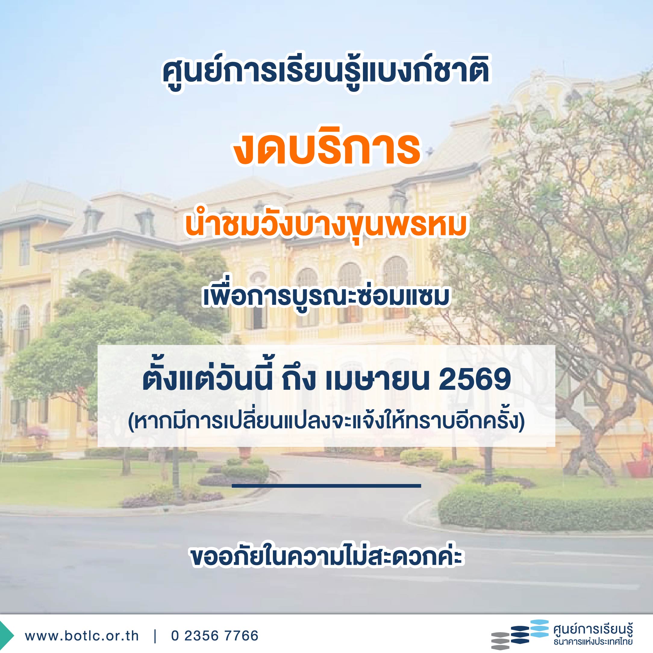 ของดบริการนำชมวังบางขุนพรหม ตั้งแต่วันนี้ ถึง เม.ย. 69 เพื่อการบูรณะซ่อมแซม ขออภัยในความไม่สะดวกค่ะ (หากมีการเปลี่ยนแปลงจะแจ้งให้ทราบอีกครั้ง)