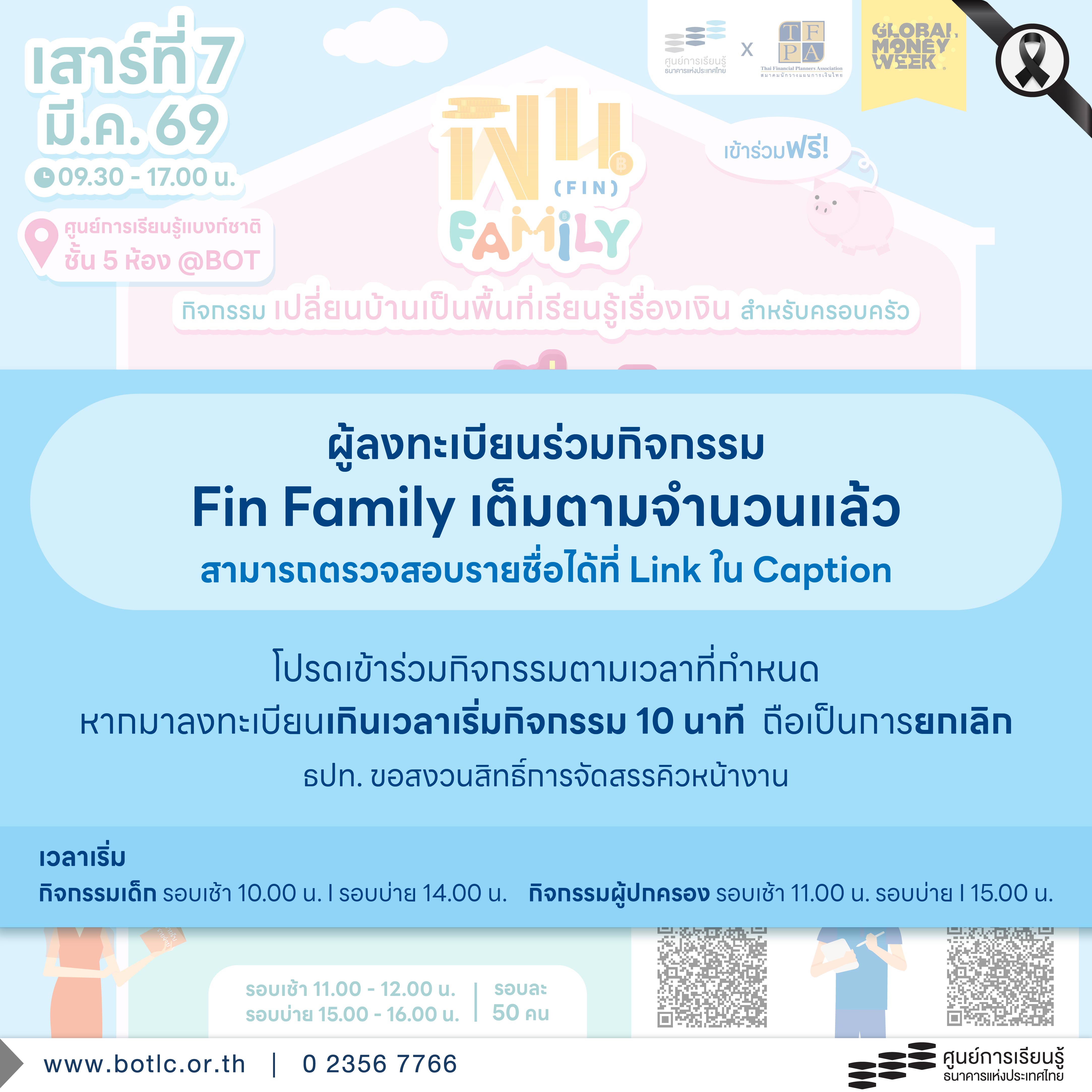 ประกาศรายชื่อผู้ร่วมกิจกรรม “ฟิน(FIN) Family” | เสาร์ที่ 7 มี.ค. 69 | ที่ศูนย์การเรียนรู้แบงก์ชาติ