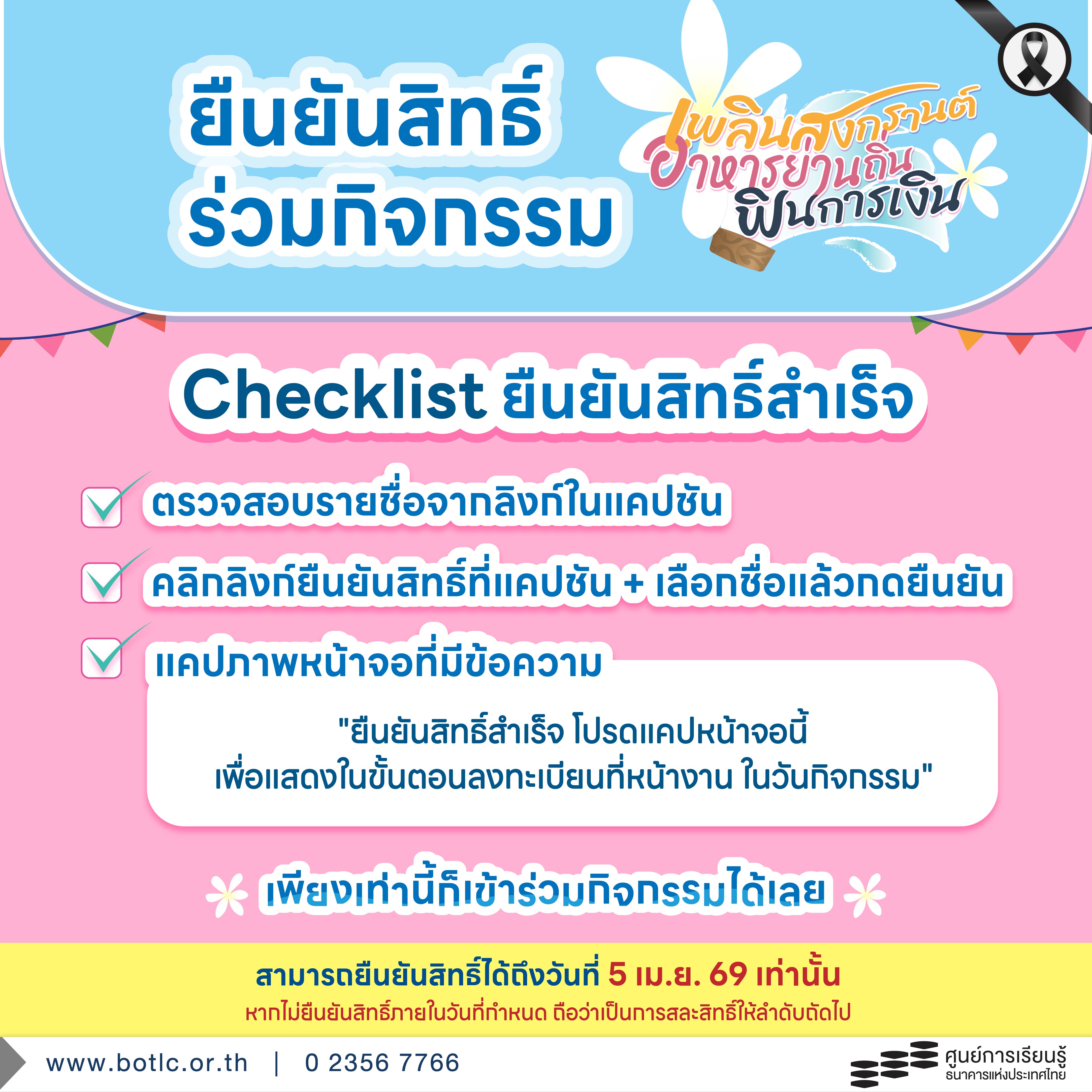 ประกาศรายชื่อเพื่อยืนยันสิทธิ์ร่วม Workshop บุหงารำไป (เพลินสงกรานต์ อาหารย่านถิ่น ฟินการเงิน) | เสาร์ที่ 18 เม.ย. 69 | ศูนย์การเรียนรู้ ธปท.