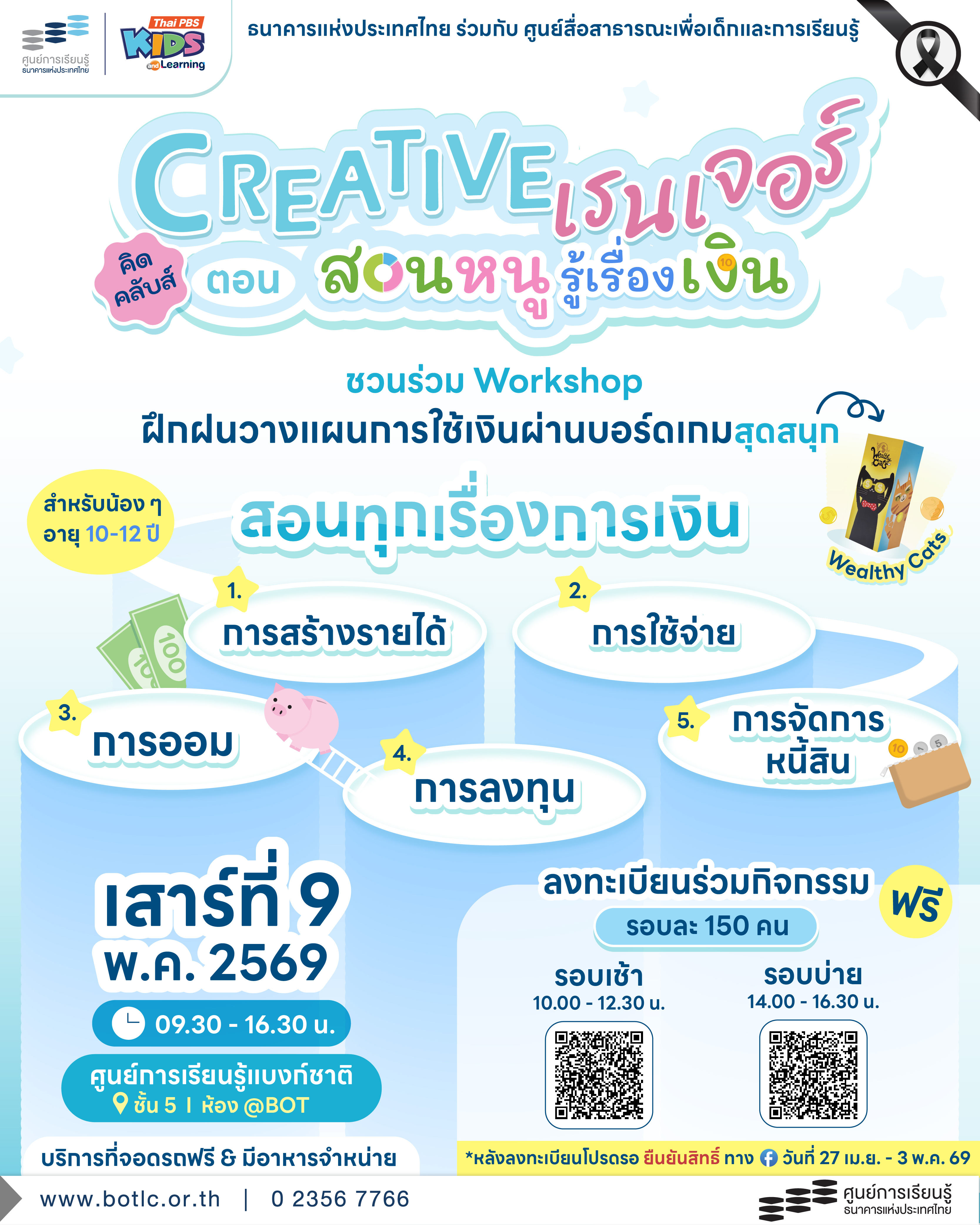 วันเสาร์ที่ 9 พ.ค. 69 ศูนย์การเรียนรู้แบงก์ชาติและ Thai PBS Kids ชวนร่วมกิจกรรม "Creative เรนเจอร์ : คิดคลับส์" ตอน “สอนหนูรู้เรื่องเงิน” ชวนน้อง ๆ 10 - 12 ปี มาเรียนรู้เรื่องการเงินทุกด้าน ทั้งการหารายได้ ใช้จ่าย ออม ลงทุนและจัดการหนี้ ผ่านบอร์ดเกม WealthyCats